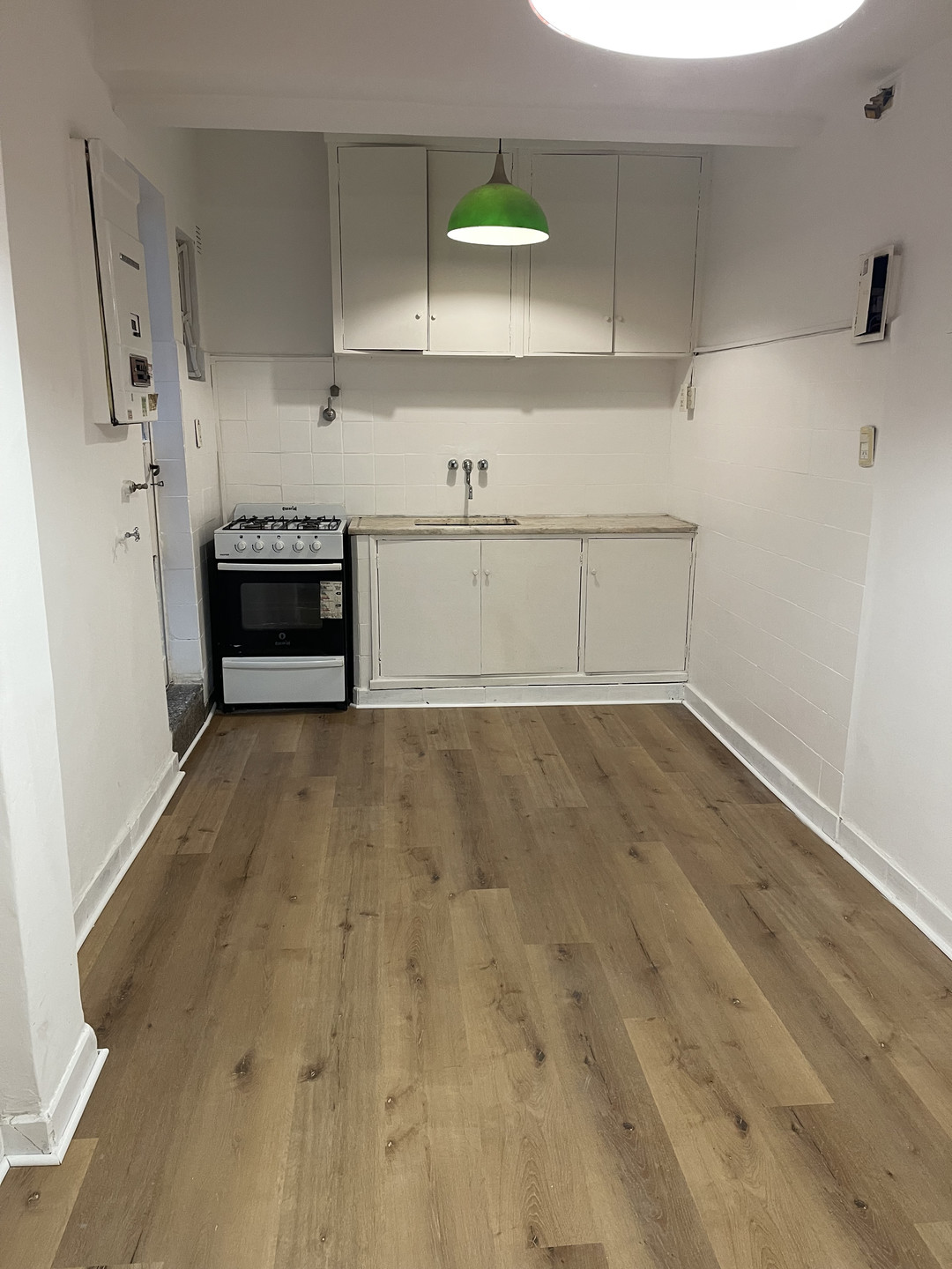 Se ingresa y hacia la derecha se encuentra la cocina integrada con el ambiente con mueble sobre mesada y alacena, cocina de 4 hornallas y horno a gas, calefon con salida al exterior. Desde la cocina se sale a muy lindo balcon lleno de luz con pileta de lavar.